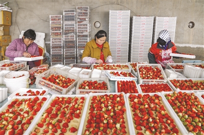 洮南市福顺镇村民王文志2010年从辽宁省引进优良草莓品种,并利用暖棚种植成功。为了带动更多村民致富,他组织成立了文志草莓水稻种植合作社,现有成员51户、暖棚60栋。草莓从每年12月开始上市,销售可持续到次年6月末,年销售收入可达350万元。图为合作社成员挑选草莓打包装盒。 记者李晓明摄