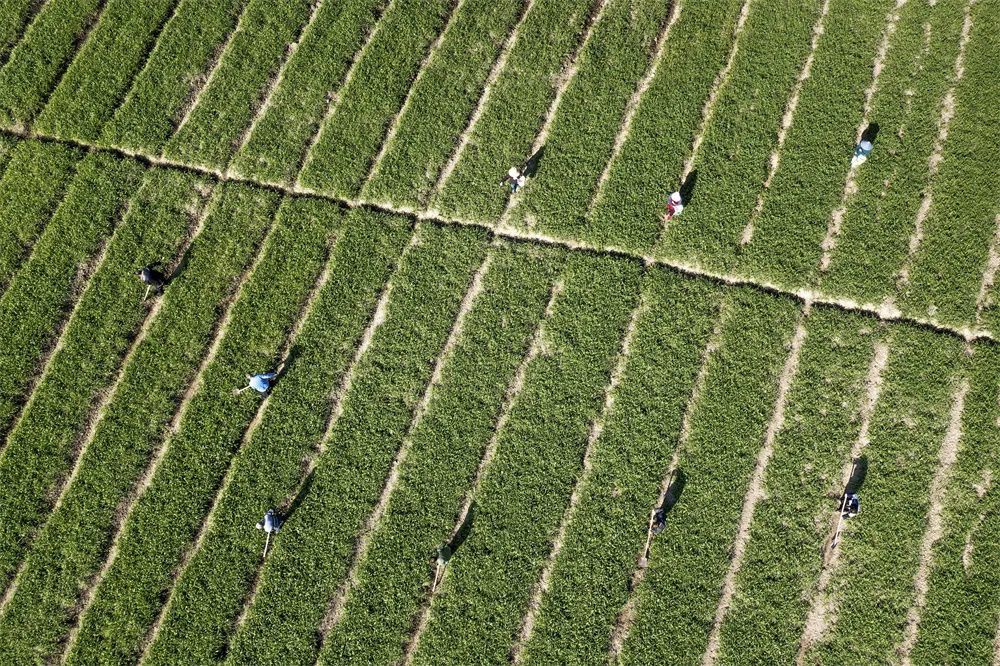 2023年1月31日,村民在浙江省诸暨市同山镇绿剑村的田间护理小麦(无人机照片)。新华社发(郭斌 摄)