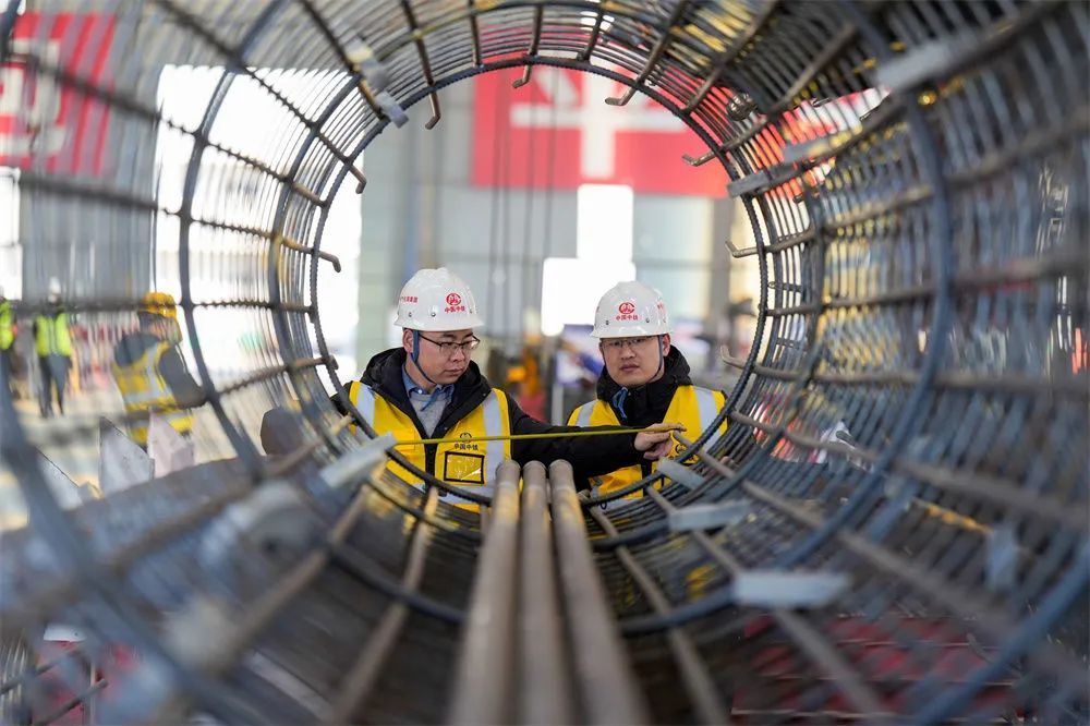 2023年2月25日,在雄忻高铁雄保段一标段钢筋加工场内,中铁电气化局的施工人员检测钢筋质量。新华社记者 牟宇 摄