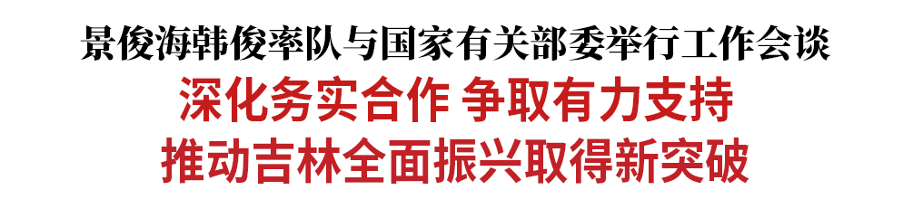 在与国务院国资委党委书记、主任张玉卓会谈时,景俊海、韩俊衷心感谢国务院国资委长期以来对吉林的大力支持。景俊海说,多年来,国务院国资委与吉林省开展了深入务实合作,大力支持驻吉央企改革发展,指导央企在吉林投资布局重大项目,推动“央企吉林行”活动取得扎实成效。希望国务院国资委一如既往关注吉林、支持吉林、帮助吉林,聚焦吉林“一主六双”高质量发展战略、“六新产业”发展和“四新设施”建设,常态化开展“央企吉林行”活动,推动央企的资本、技术、人才、管理优势与吉林坚实产业基础、良好资源禀赋相结合,在国企改革等方面给予吉林更多工作指导和政策倾斜,助力吉林培育振兴发展新动能。